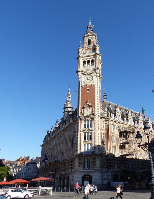 Nous parcourons la Grand'Place (née au Moyen-Âge) devenue place Charles de Gaulle, celui-ci étant né à Lille en 1890. Sur celle-ci se côtoient la Vieille bourse, la statue de la Déesse, la Voix du Nord, le Théâtre du Nord à l’architecture totalement différente du reste car érigé vers 1717, d’architecture classique avec les armoiries de France et de Lille.