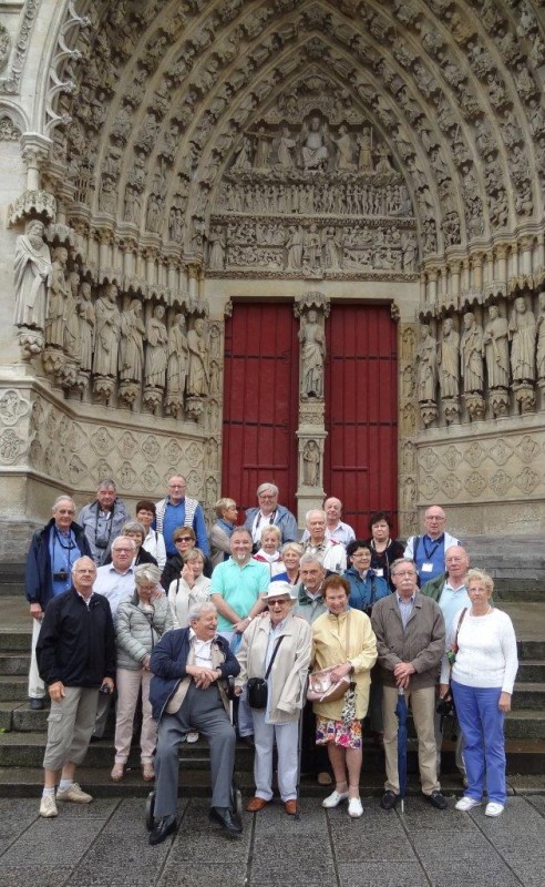 La visite guidée de la cathédrale d’Amiens commence sous la pluie mais nous résolvons rapidement cette situation en nous couvrant de quasi sacs poubelles effets garantis ! La cathédrale Notre Dame est la plus vaste par ses volumes intérieurs, de style gothique classique mais avec des éléments du gothique rayonnant (le chevet) et du gothique flamboyant (grande rosace, tour Nord et stalles). Elle a été érigée de 1220 à 1288 sous l’impulsion de l’évêque Évrard de Fouilloy, à la suite de l’incendie de l’ancien édifice. Cet édifice mesure 145m de long, 70m de large et 42m sous clef de voûte. En raison de l’affluence des dons, les travaux progressent très rapidement sous l’égide de Renault puis Thomas de Cormont. Le labyrinthe d’Amiens mesure 234 m. compris dans un octogone dont le centre symbolise le paradis de la Jérusalem Céleste (il en existe d’autres à St Quentin, Chartres, Reims ) Ce labyrinthe devait être parcouru à genoux par les fidèles. Le chœur se compose de 110 stalles du XVIe comprenant environ 4000 personnages différents de toute beauté. Le portail du Jugement dernier au centre de la façade était à l’origine en polychromie ainsi que les portails de part et d’autre, consacré à la mère de Dieu à droite et à St Firmin à gauche.
